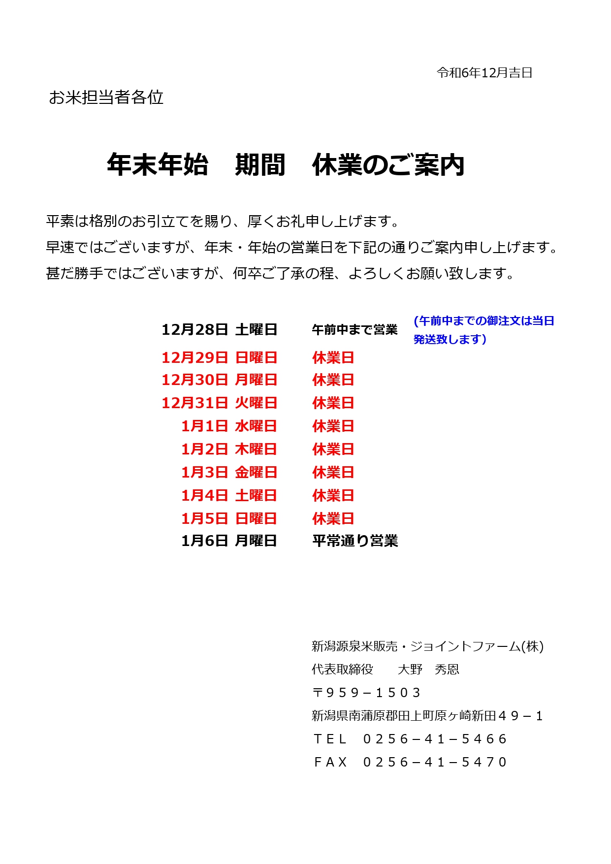 弊社年末年始の休業は12/29~1/5までとなります。年内の最終発送は12/28午前中まで承ります。